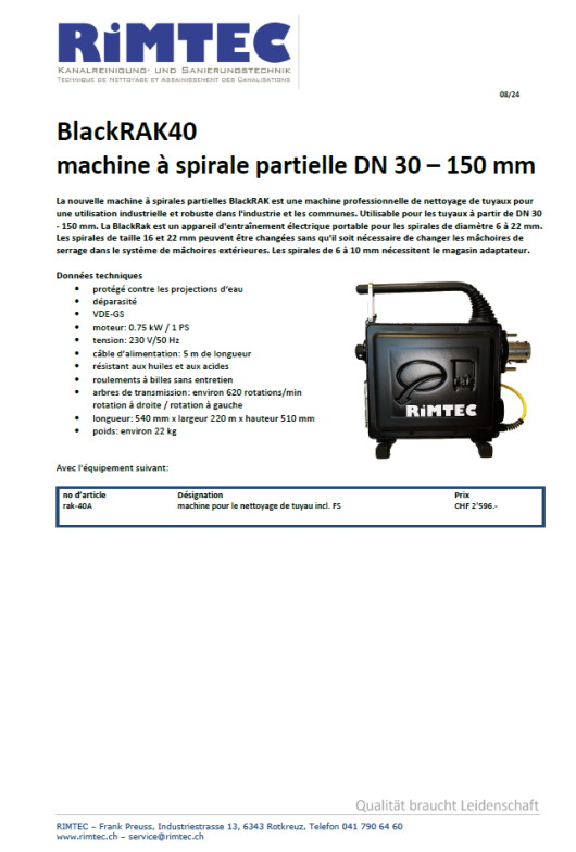 La nouvelle machine à spirales partielles BlackRAK est une machine professionnelle de nettoyage de tuyaux pour une utilisation industrielle et robuste dans l'industrie et les communes. Utilisable pour les tuyaux à partir de DN 30 - 150 mm. La BlackRak est un appareil d'entraînement électrique portable pour les spirales de diamètre 6 à 22 mm. Les spirales de taille 16 et 22 mm peuvent être changées sans qu'il soit nécessaire de changer les mâchoires de serrage dans le système de mâchoires extérieures. Les spirales de 6 à 10 mm nécessitent le magasin adaptateur.
