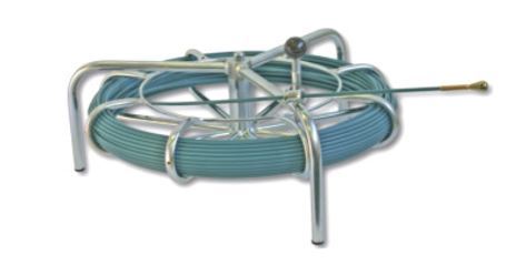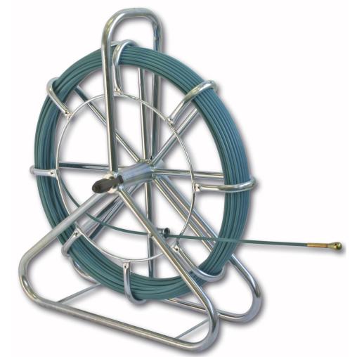 Tuyau anguille avec tige en fibre de verre DN 6.0 mm avec enrobage en polypropylène, complet avec avec filetage M6 et tête de traction M6 avec oeillet, sur touret en acier inoxydable en version horizontale avec un panier du DN 550 mm