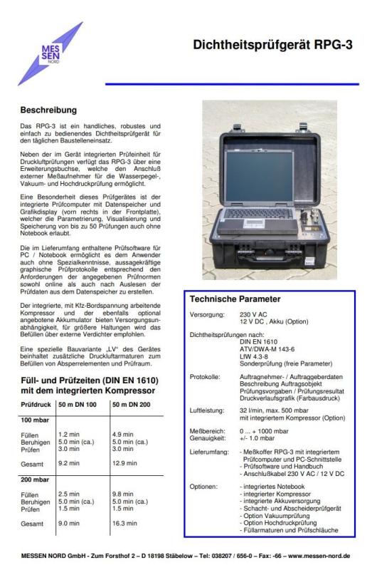 Avec l'option "contrôle des collecteurs", l'appareil RPG-3 est capable de mesurer avec haute précision la plus petite variation du niveau de l'eau et de donner les informations requises par les normes DIN EN 1610 et ATV/DWA-M 143 (regards) et DIN 1999-100 (collecteur)