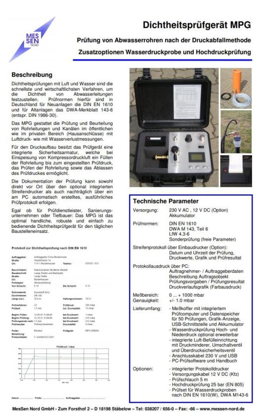 L'MPG consente di testare e valutare le condutture e le fognature del settore pubblico e privato (allacciamenti domestici) con la pressione dell'aria e con la misurazione delle perdite d'acqua.
