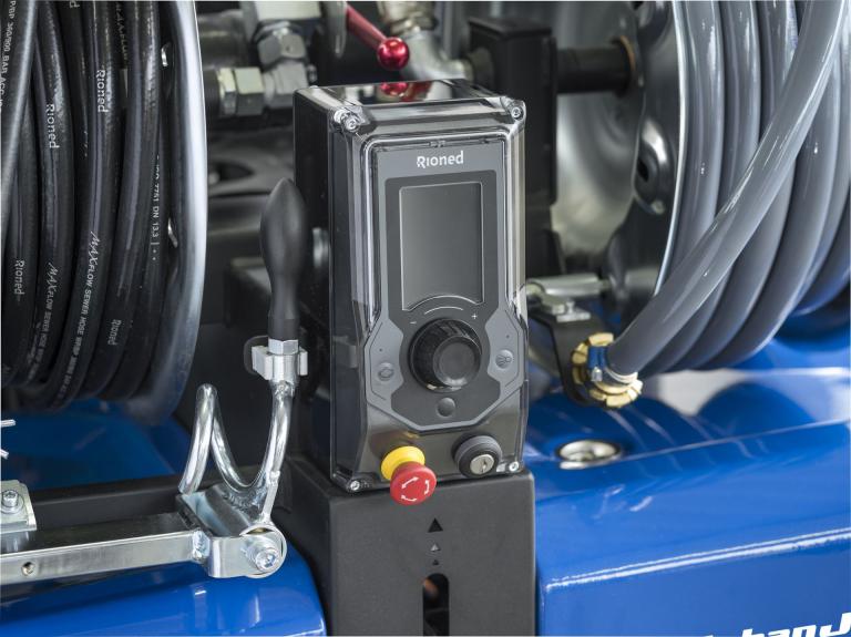 Con l'aiuto del telecomando RioMote, l'unità può essere facilmente gestita da una sola persona. Il telecomando a 5 canali RioMote consente di controllare la pompa ad alta pressione e il motore su tutte le unità con motore a benzina. Anche i motori diesel delle unità corrispondenti possono essere avviati e spenti con il nostro radiocomando a 7 canali. Naturalmente, ogni trasmettitore portatile è dotato anche di un interruttore di arresto di emergenza. Il telecomando RioMote si distingue in particolare per la sua lunga portata. Grazie al caricabatterie in dotazione, avrete sempre una batteria di riserva piena e sarete quindi sempre pronti all'azione.