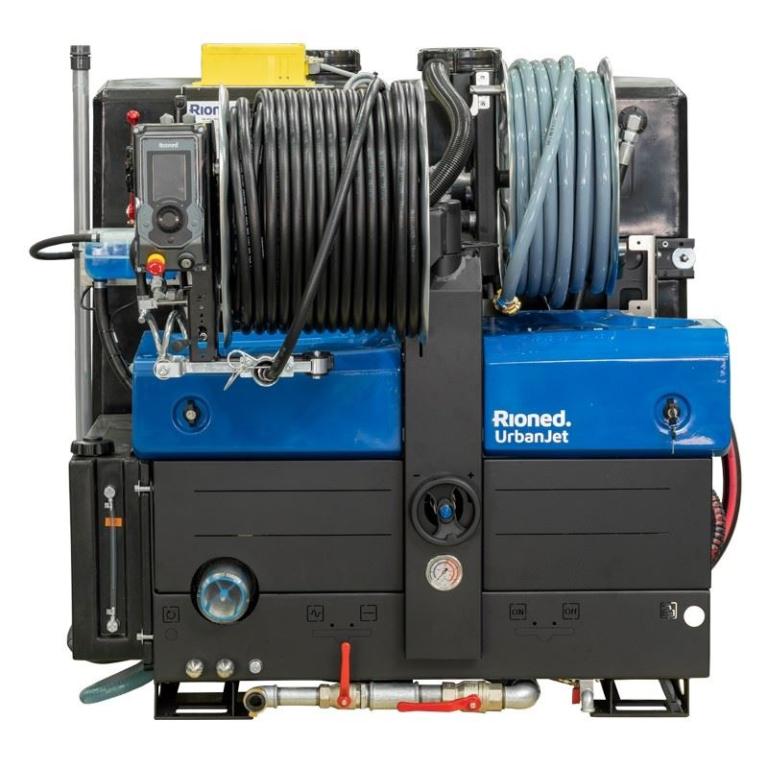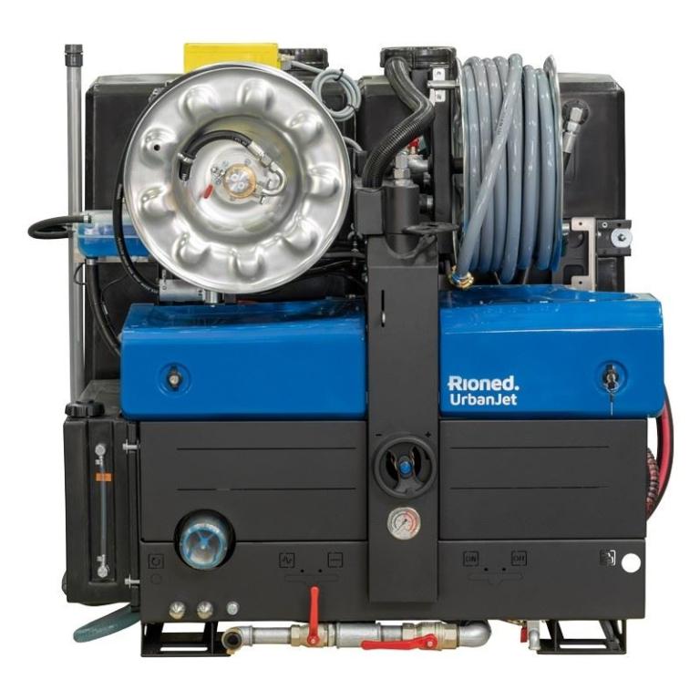 L'UrbanJet viene fornito come pacchetto completo con un tubo flessibile leggero ad alta pressione MaxFlow da 60 m* su un avvolgitore azionato idraulicamente e un tubo di riempimento da 35 m (NW 19, anch'esso su un avvolgitore).