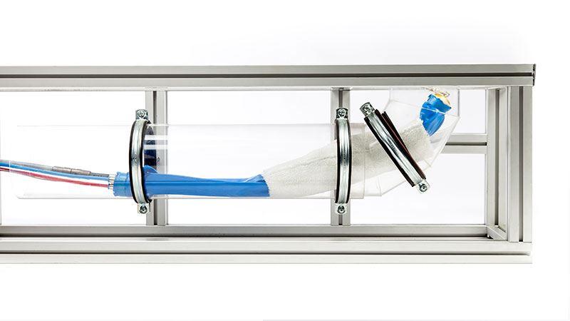 Durante il risanamento, un manicotto di connessione impregnato di resina epossidica viene tirato sul packer speciale e l'albero viene spinto nel packer. Grazie alle aste di spinta flessibili, il packer può essere facilmente inserito, soprattutto nelle curve, e posizionato esattamente all'ingresso. Il packer si gonfia quando viene immessa aria e spinge l'albero nell'ingresso.