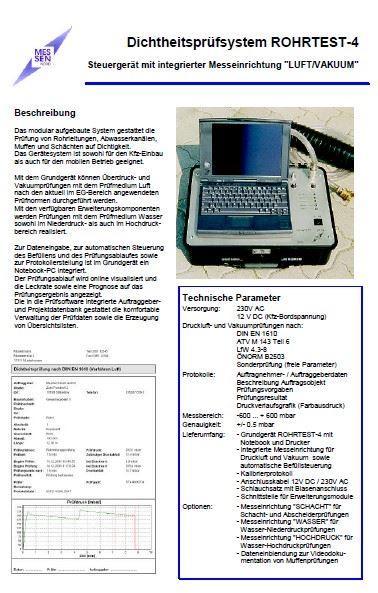 Das modular aufgebaute System gestattet die Prüfung von Rohrleitungen, Abwasserkanälen, Muffen und Schächten auf Dichtigkeit. Das Gerätesystem ist sowohl für den Kfz-Einbau, als auch für den mobilen Betrieb geeignet. Mit dem Grundgerät können Überdruck- und Vakuumprüfungen mit dem Prüfmedium Luft nach den aktuell im EG-Bereich angewendeten Prüfnormen durchgeführt werden.