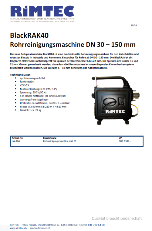Die neue Teilspiralmaschine BlackRAK ist eine professionelle Rohrreinigungsmaschine für den industriellen und robusten Einsatz in Industrie und Kommune. Einsetzbar für Rohre ab DN 30 - 150 mm. Die BlackRak ist ein tragbares elektrisches Antriebsgerät für Spiralen der Durchmesser 6 bis 22 mm. Die Spiralen der Grösse 16 und 22 mm können gewechselt werden, ohne dass die Klemmbacken im aussenliegenden Klemmbackensystem gewechselt werden müssen. Die Spiralen 6 – 10 mm benötigen das Adaptermagazin.