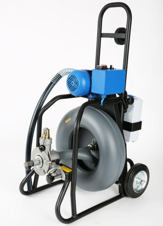 Auch diese Maschine arbeitet zum Schutz der Hände vor der drehenden Spirale mit dem automatischen Vorschub. Die Spirale mit einem Durchmesser von 20 mm bei 20 m Länge verschwindet nach getaner Arbeit in einem abnehmbaren Trommel- Behälter und verursacht somit vor Ort keine Verschmutzungen. Die maximale Arbeitslänge kann mit Hilfe von 2 weiteren Trommelsätzen auf insgesamt 60 m erweitert werden.